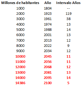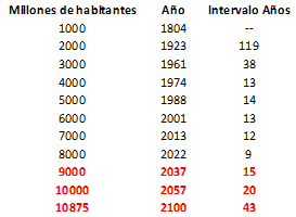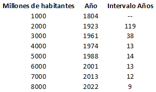 La realitat és que la velocitat de creixement de la població mundial està avançant de forma aclaparadora. La taula adjunta mostra els anys en què es van assolir des dels mil milions d’habitants fins als 8.000 milions actuals, i veiem que de manera continuada l’interval de creixement de cada 1.000 milions és més curt. Així, per passar d’1.000 a 2.000 milions es van trigar 119 anys; en canvi, per guanyar els 1.000 milions que van de 7.000 a 8.000 milions d’habitants només s’han trigat nou (9) anys.