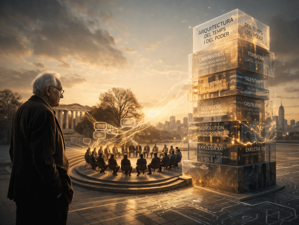 Potser, en última instància, aquest és el fil que connecta l’obra de Habermas amb l’Arquitectura del Temps i del Poder: la convicció que la convivència humana no pot sostenir-se indefinidament sobre la inèrcia, que cal pensar-la de nou, situar-la en el seu temps i entendre els mecanismes que la travessen. No des de la certesa absoluta, sinó des d’una lucidesa que no es permet el luxe de ser còmoda. I és en aquest exercici —lent, exigent, incòmode— on es juga, sense grans proclamacions però amb conseqüències profundes, la possibilitat d’una democràcia que no sigui només una paraula, sinó una realitat viscuda.